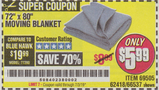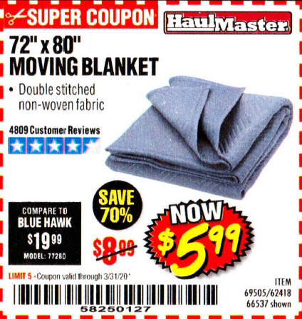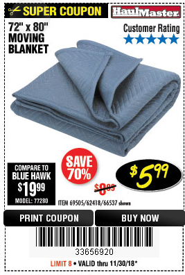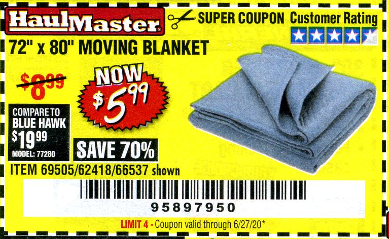 HAUL-MASTER 72 In. X 80 In. Moving Blanket for $5.99 - Harbor Freight ... Moving Blanket (Item 66537) for $5.99 with coupon code 39326850, valid through February 29, 2020. See the coupon for details. Compare our price of $5.99 to Blue Hawk at $19.99 (model number: 77280). Save 70% by shopping at Harbor Freight.