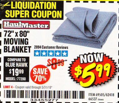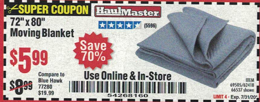HAUL-MASTER 72 In. X 80 In. Moving Blanket for $5.99 - Harbor Freight ... Click here for more Harbor Freight deals. HAUL-MASTER 72 In. X 80 In. Moving Blanket for $5.99 Inside Track Club members can buy the HAUL-MASTER 72 In. X 80 In. Moving Blanket (Item 66537) for $5.99, valid through April 8, 2021. Compare our price of $5.99 to BLUE HAWK at $19.99 (model number: 77280). Save 70% by shopping at Harbor Freight.